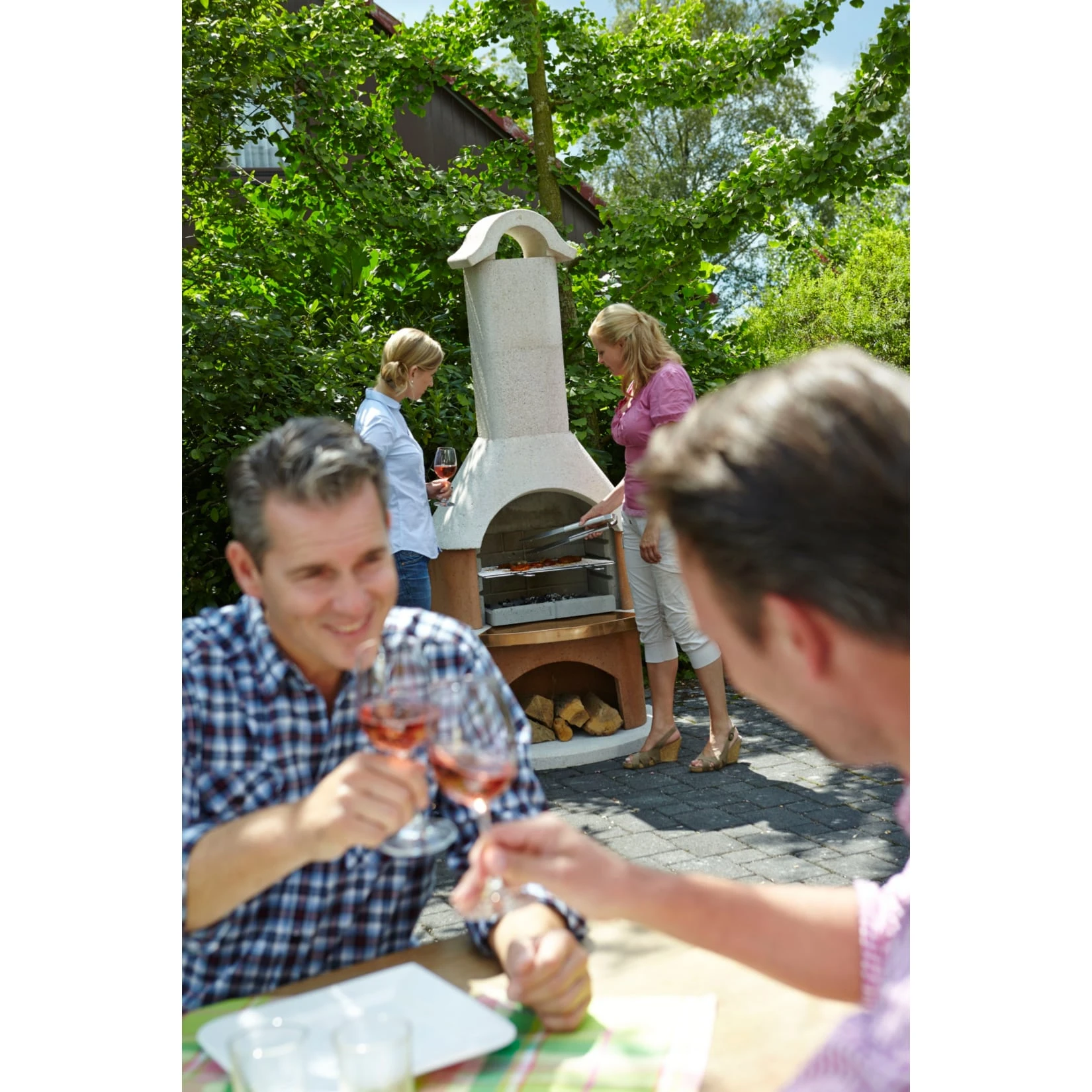 Kein Verputzen oder Streichen notwendig, 24 Stunden nach dem Aufbau ist der Gartengrillkamin betriebsfertig. Die zweischalige Bauweise erlaubt das Grillen mit Holzkohle und das Befeuern mit Holz.