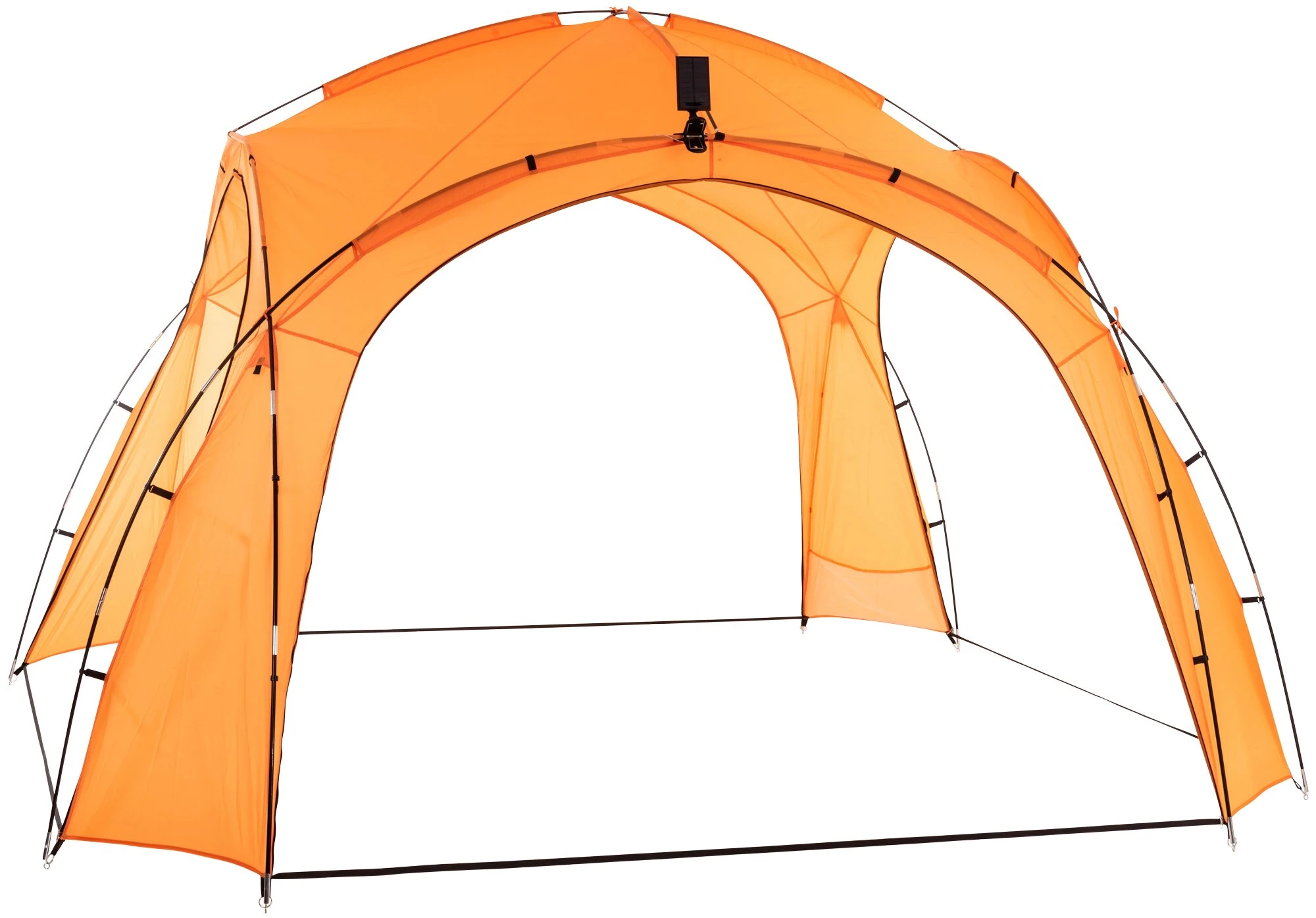 Im Innenraum ist eine große Seitentasche, sowie eine zusätzliche Lampenhalterung in der Mitte. Die im Lieferumfang enthaltene Tragetasche sorgt für den einfachen und platzsparenden Transport. Für die maximale Stabilität sind noch Abspannseile und Erdhaken enthalten.