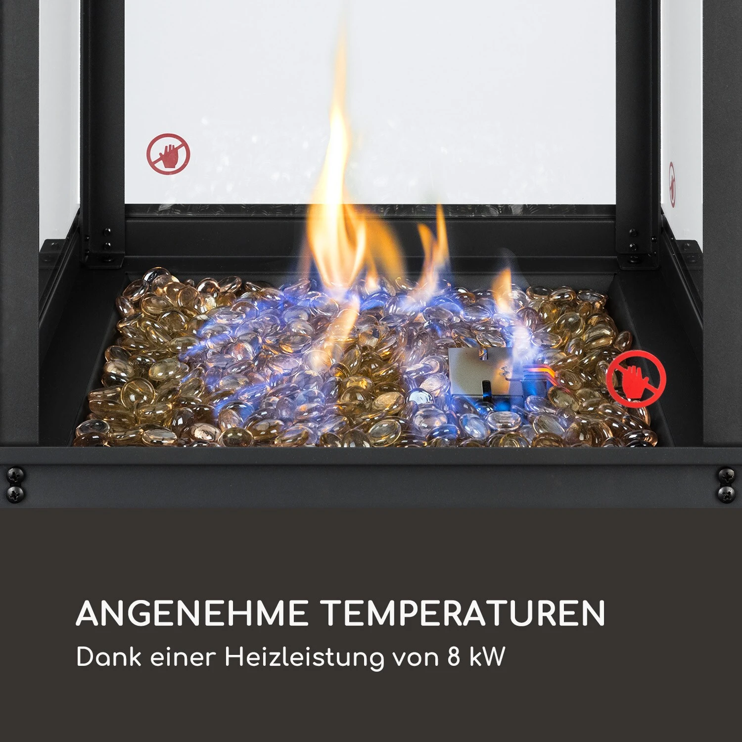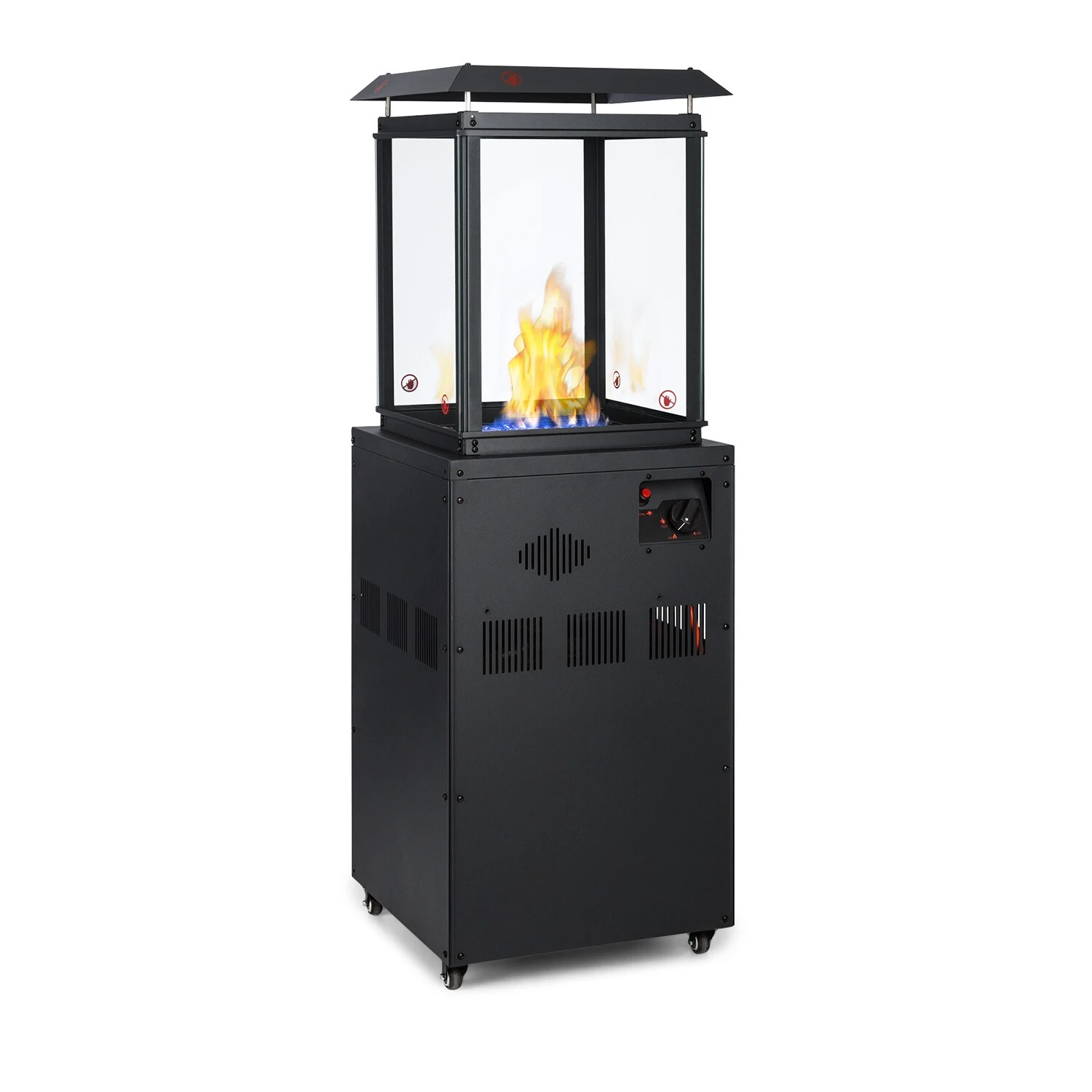 Blumfeldt Flagranti Gasheizstrahler | Freiluftheizung | 8 kW Heizleistung | Gasflaschen bis zu 11 kg | 4 Sichtfenster aus gehärtetem Glas | Bodenrollen mit Feststellbremsen | elektrisches Zündsystem | Kippschutz | inkl. Schlauch & Druckminderer | mit stilvoller Steindekoration | Edelstahl | schwarz