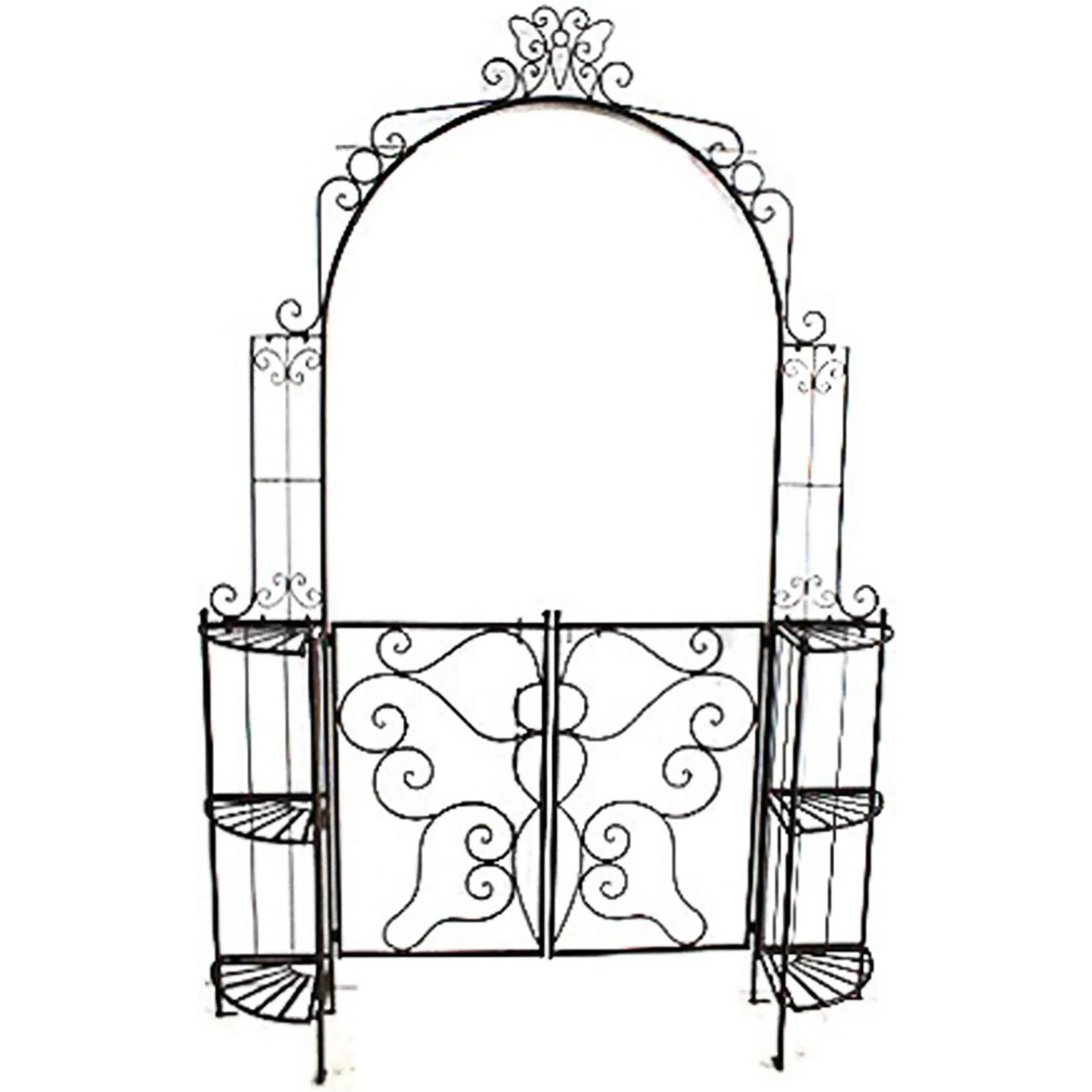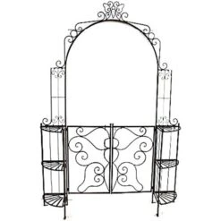 Dekorativer Rosenbogen LAKI in schwarz mit Pforte und Eckregalen als optimale Ergänzung für Ihren Garten. Ob als Rankhilfe für Ihre Pflanzen oder stilvolle Dekoration mit dem Rosenbogen LAKI schaffen Sie einen romantischen Eingang zu Ihrem Garten oder verschiedenen Gartenbereichen
