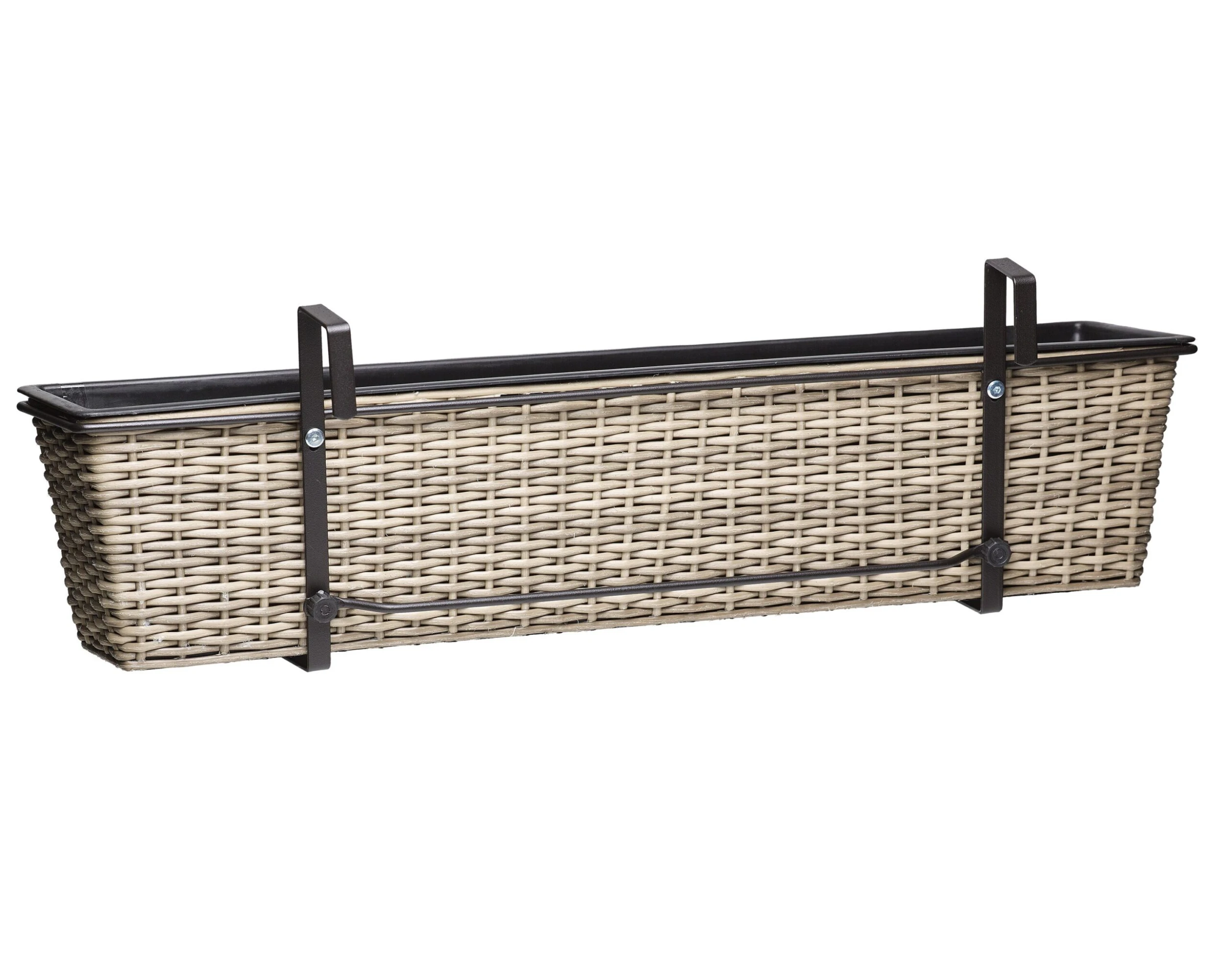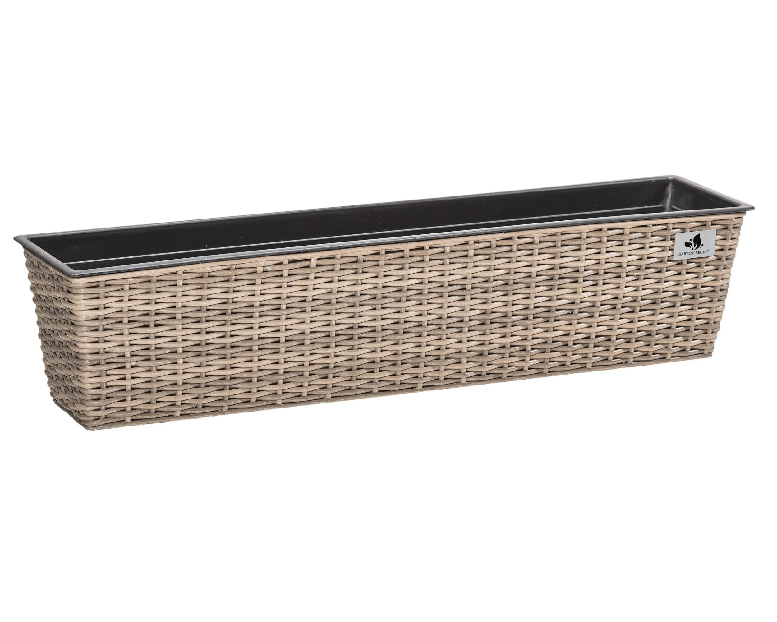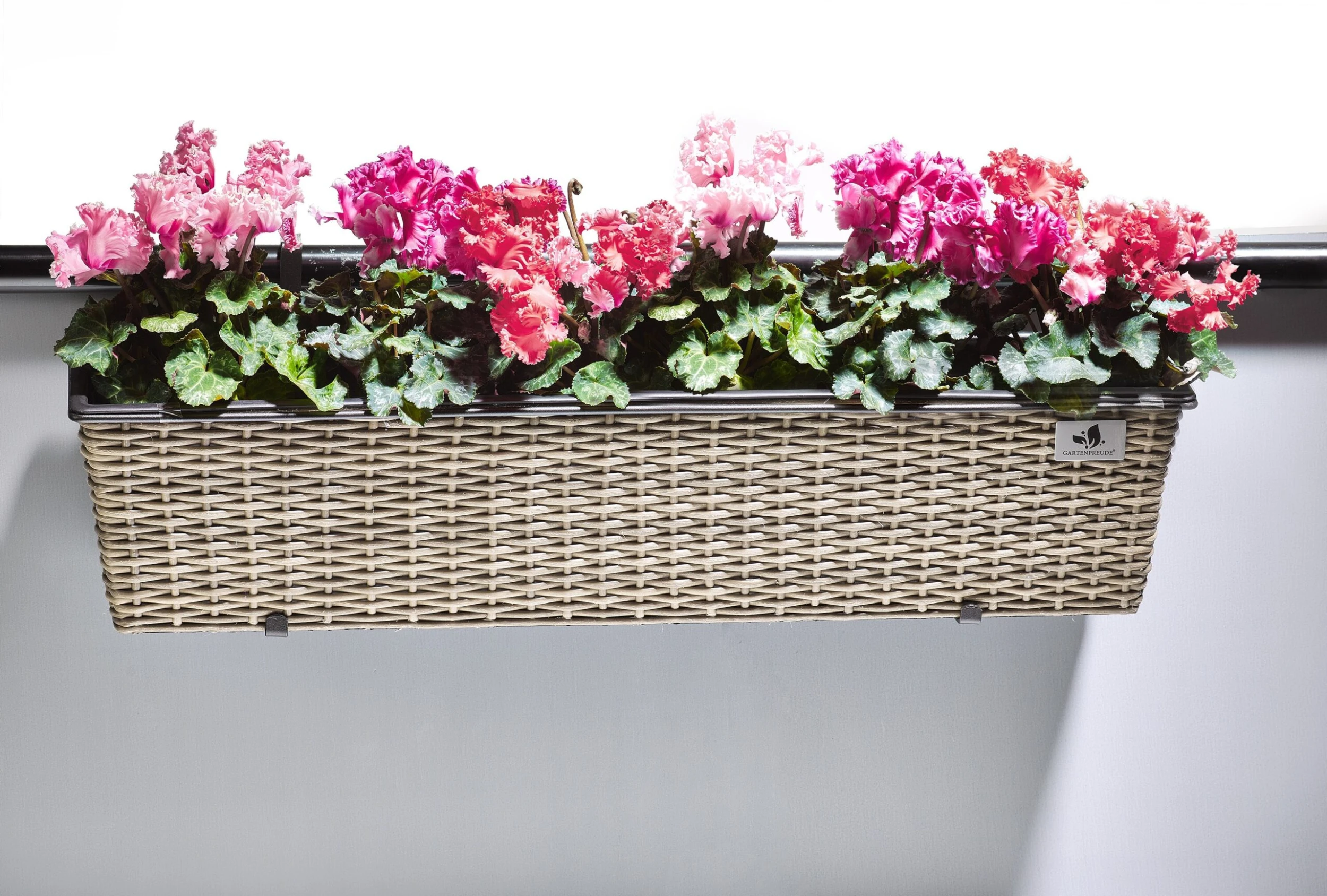 Polyrattan Balkonkasten inkl. Aufhängung, 80x19x18cm, mit Bewässerungssystem. Der Balkonkasten mit handgeflochtenem Polyrattan sorgt für dekorative Akzente. Ein Blickfang für den Balkon und Garten von der Marke GARTENFREUDE! Größe: 80x19x18cm. Seltener gießen mit dem integrierten Wasserspeicher, optimale Versorgung durch das Bewässerungssystem und Gießkontrolle durch den Wasserstandsanzeiger. Die wertvolle Kunststofffaser besticht durch hervorragende Eigenschaften: langlebig, pflegeleicht und witterungsbeständig. Mit Überläufen im Boden um einen Wasserstau zu vermeiden, die bei Aufstellung im Haus (z.B. im Wintergarten) einfach mit beigefügten Kunststoffschrauben verschlossen werden. Die Balkonkasten-Halterung ist einfach und schnell zu montieren. Die Aufnahmeöffnung der Haken ist für bis zu 5,8cm breite Balkonbrüstungen bzw. Geländer geeignet.