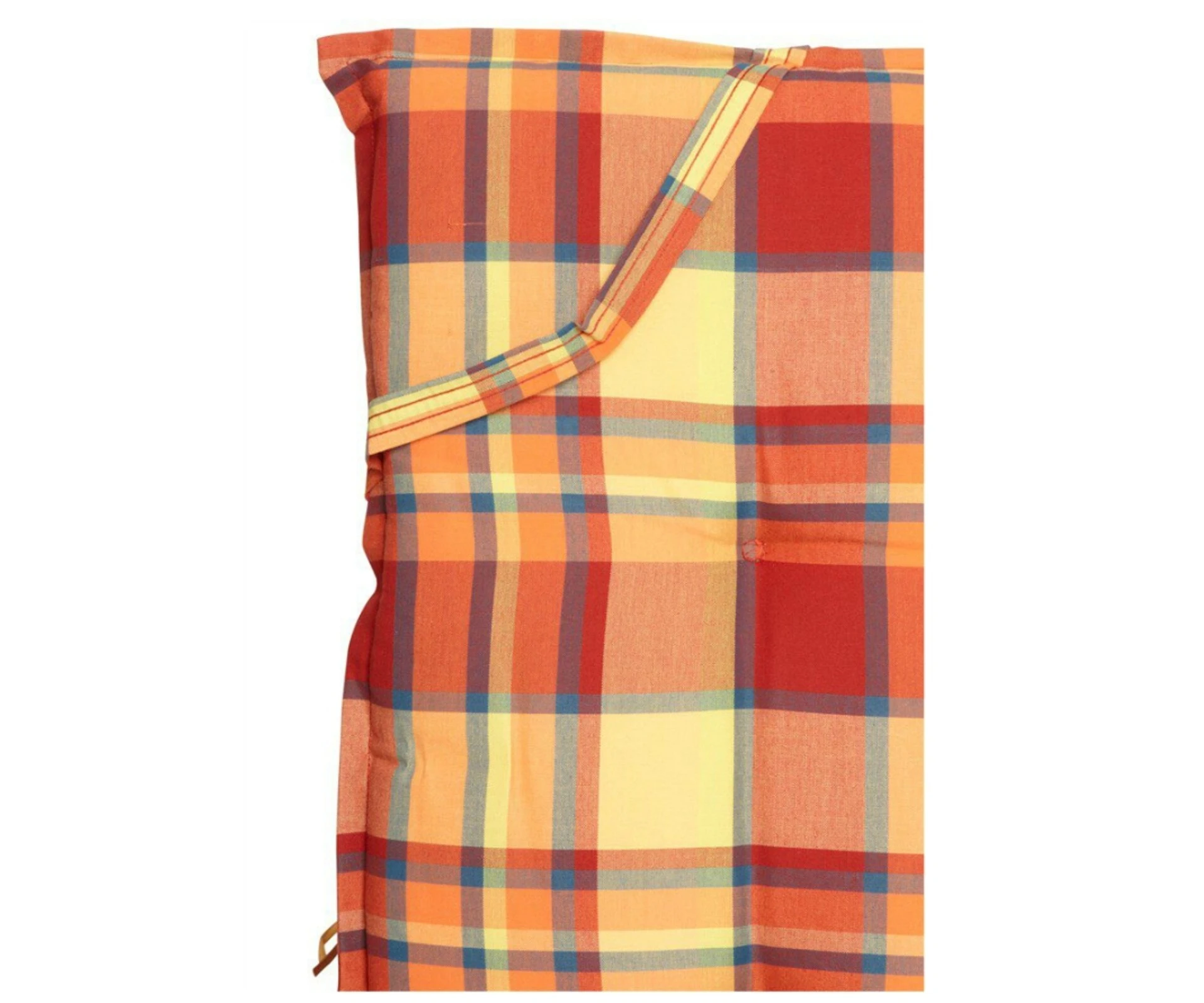 Die Auflage im bunten Karodesign lädt zum Relaxen ein. An der Rückseite sind flexible Haltegurte, zum Befestigen an der Rückenlehne, vernäht. Für den optimalen Halt sind zusätzlich Bänder am Sitzbereich zur Befestigung angebracht.