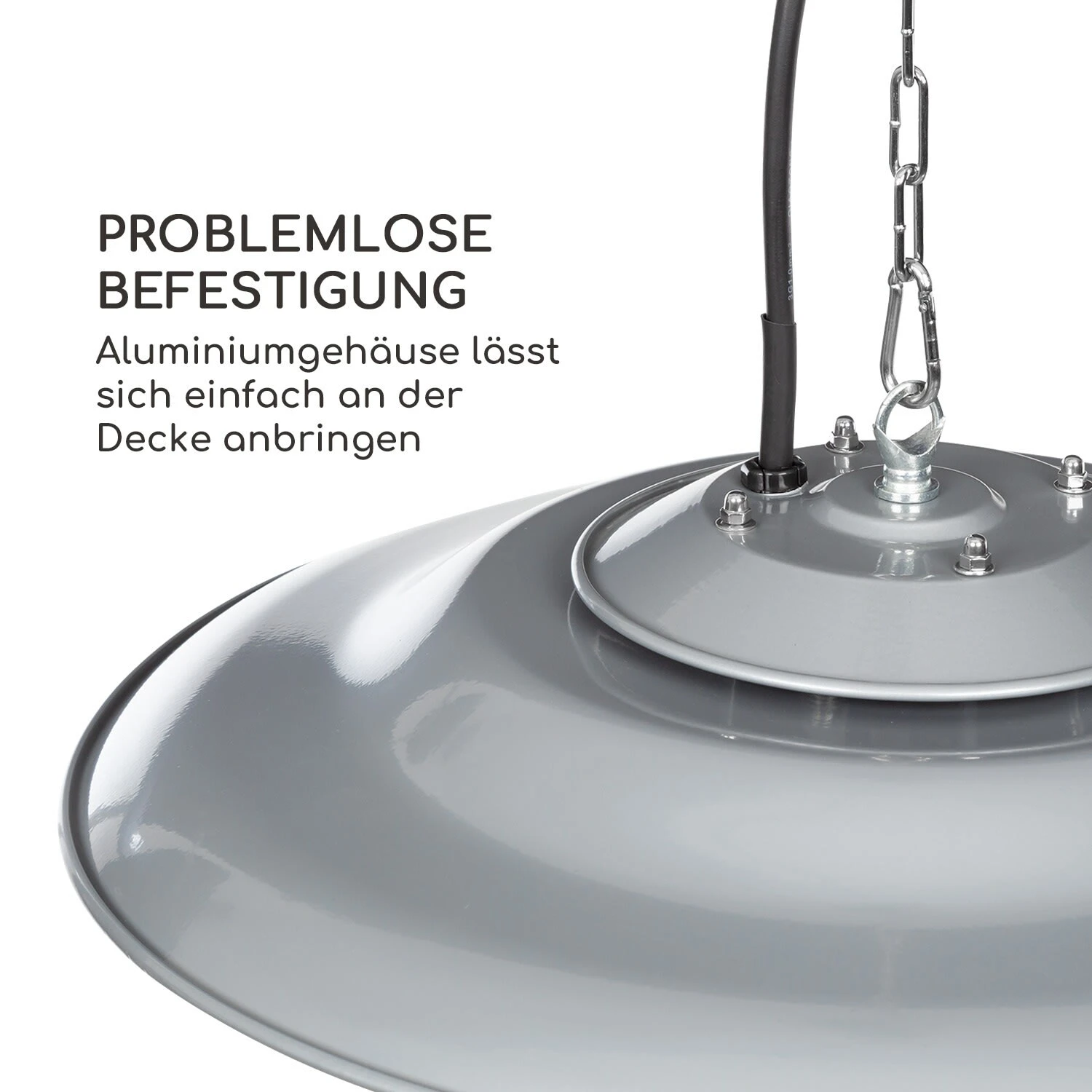 Unkomplizierte Deckeninstallation mit Karabinerhängung und Schukostecker inklusive stabiler Edelstahlkette.