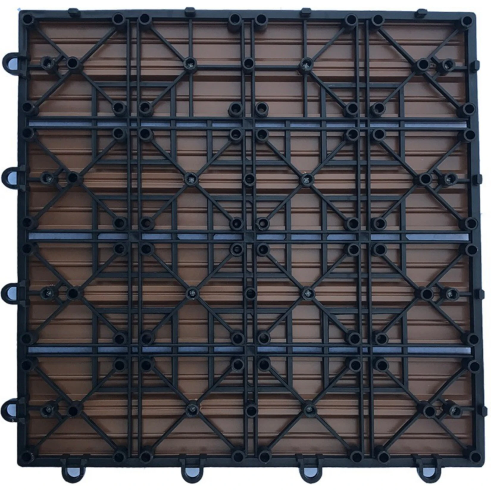 Mit unseren WPC Holzfliesen werden Ihre Terrasse und Balkon zu einem Hingucker. Gestalten Sie den Boden Ihres Außenbereichs schnell und einfach neu. Durch die Verwendung von WPC sind Ihre Terrasse und/oder Balkon sehr pflegeleicht und zugleich langlebig. Eine Nachbehandlung durch Streichen oder Ölen ist nicht notwendig. Die WPC Fliesen bestehen aus einem Gemisch von Holz und Kunststoff, das die Vorteile beider Werkstoffe ideal miteinander vereint. Die Oberfläche der Fliesen ist witterungsbeständig und splitterfrei und daher bedenkenlos barfuß begehbar. Somit eignen sich die WPC Fliesen auch hervorragend als Umrandung für Pools. Die leichte Maserung der Oberfläche sorgt für eine überzeugende Holzoptik und machen die umweltfreundlichen Fliesen zu einem echten Highlight in Ihrem Außenbereich. Die Unterseite der Terrassenfliesen ist mit einem Drainagegitter versehen, so dass diese auch nach einem Regenguss schnell trocknen und wieder ohne Rutschgefahr begangen werden können. Das praktische Klicksystem unserer Terrassenfliesen macht das Verlegen auch auf größeren Flächen kinderleicht und schnell. Die Fliesen werden einfach ineinander verhakt, wodurch eine stabile einheitliche Fläche entsteht.