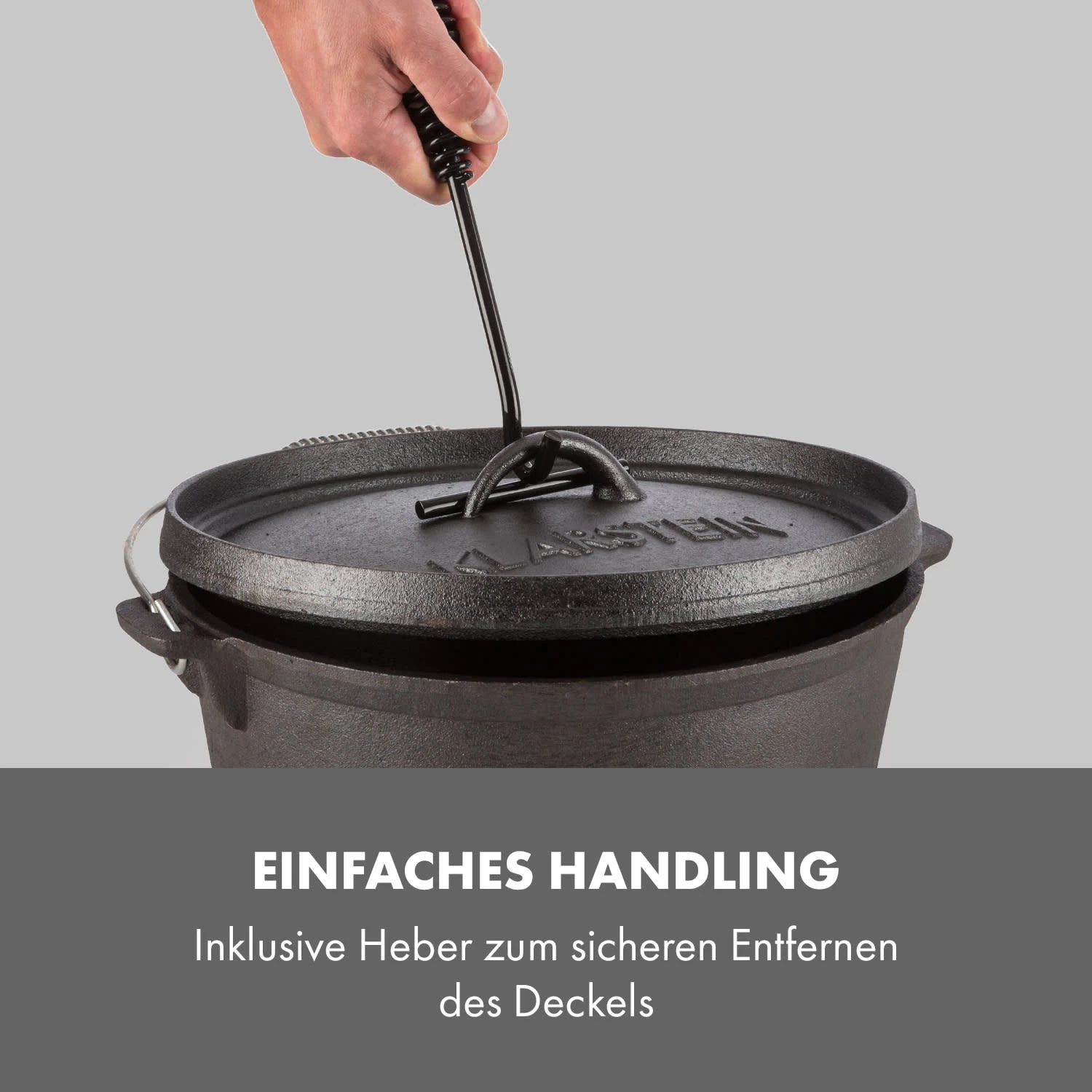 Mit dem Klarstein Hotrod BBQ-Topf entdecken Sie ursprüngliche Kochkünste neu: Egal ob Braten, Backen oder Kochen, der gusseiserne Dutch Oven wird Sie begeistern. Direkt ins offene Feuer gestellt kann es direkt losgehen, egal ob auf dem Grill, in der Feuerschale oder beim Lagerfeuer. Dank des dicht schließenden Deckels mit der extra hohen Krempe können glühende Kohlen auch zur Beheizung von oben sicher aufgeschichtet werden. Besonders praktisch: Das Gusseisen sorgt für eine optimale Verteilung der Hitze, auch bei unregelmäßig brennendem Feuer. So gelingt sogar Kuchen oder Brot ohne den Topf ins Schwitzen zu bringen. Für einfaches Handling der heißen Teile sorgt der 26 cm lange Deckelheber mit dem Sie jederzeit ins Innere des Dutch Ovens schauen können.