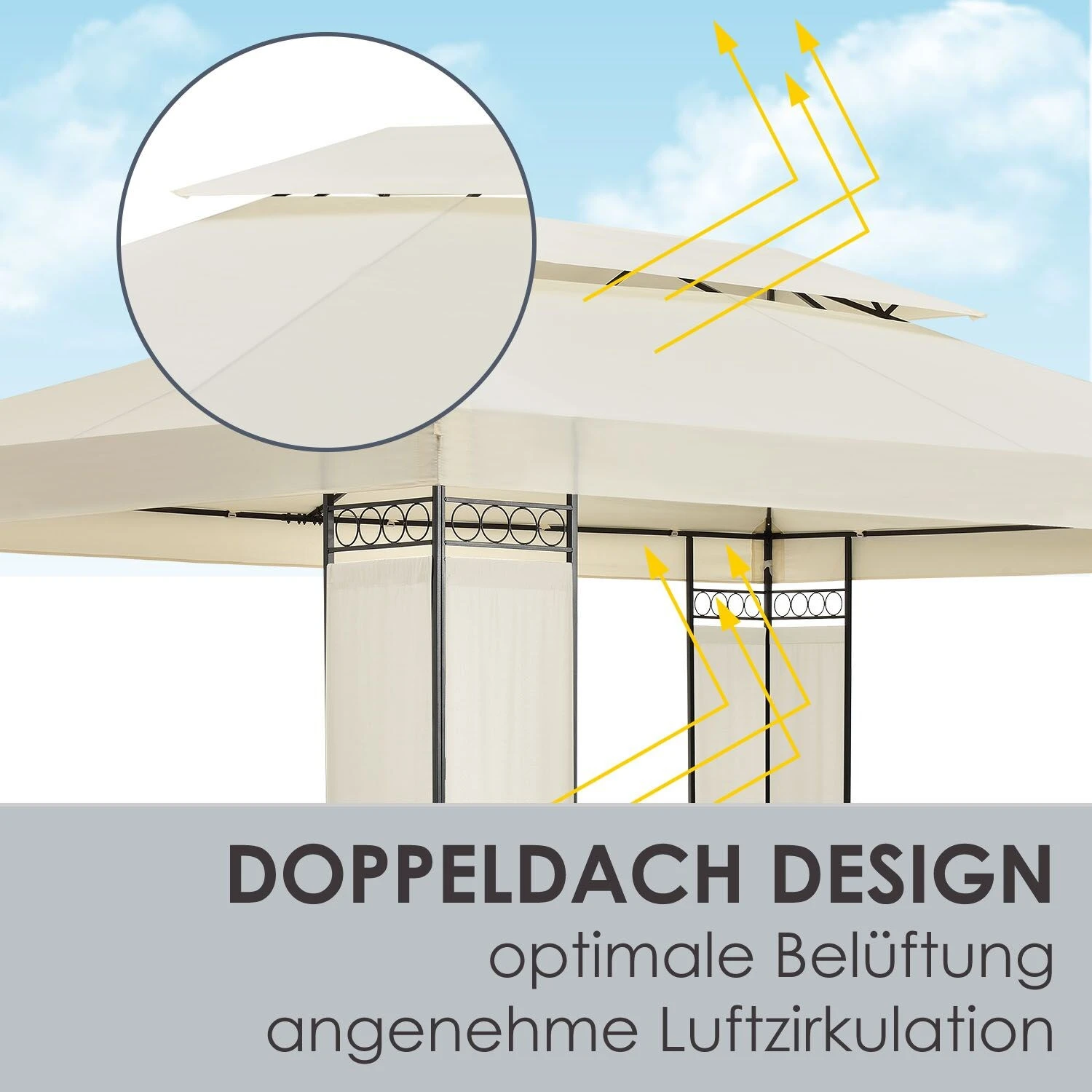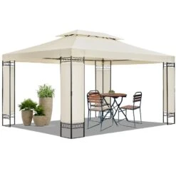 Die schlichte Optik in Beige mit den dekorativen Elementen an den Seitenpfosten gibt Ihrem Garten ein unbestechliches mediterranes Flair. Entspannen Sie mit einem Glas Rotwein unter der großen 3 x 4 m Stoffbespannung und fühlen sich wie in Italien.