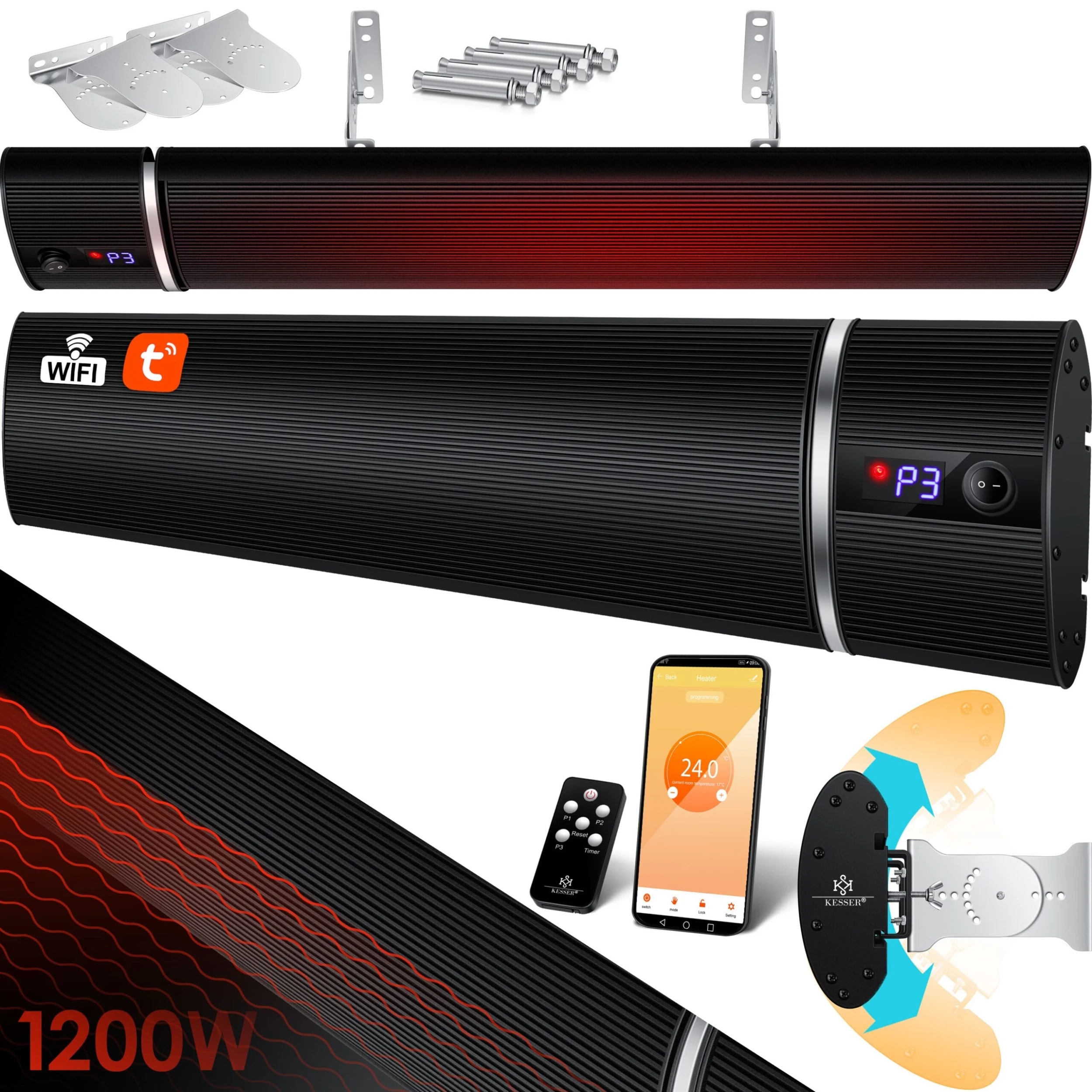 KESSER innovativer Dunkelheizstrahler mit 3 leistungsstarken Heizstufen per Fernbedienung und Tuya-WiFi App steuerbar, für Indoor und Outdoor geeignet, Inkl. Wand- und Deckenaufhängung sowie integriertem Timer und einfacher Wandmontage