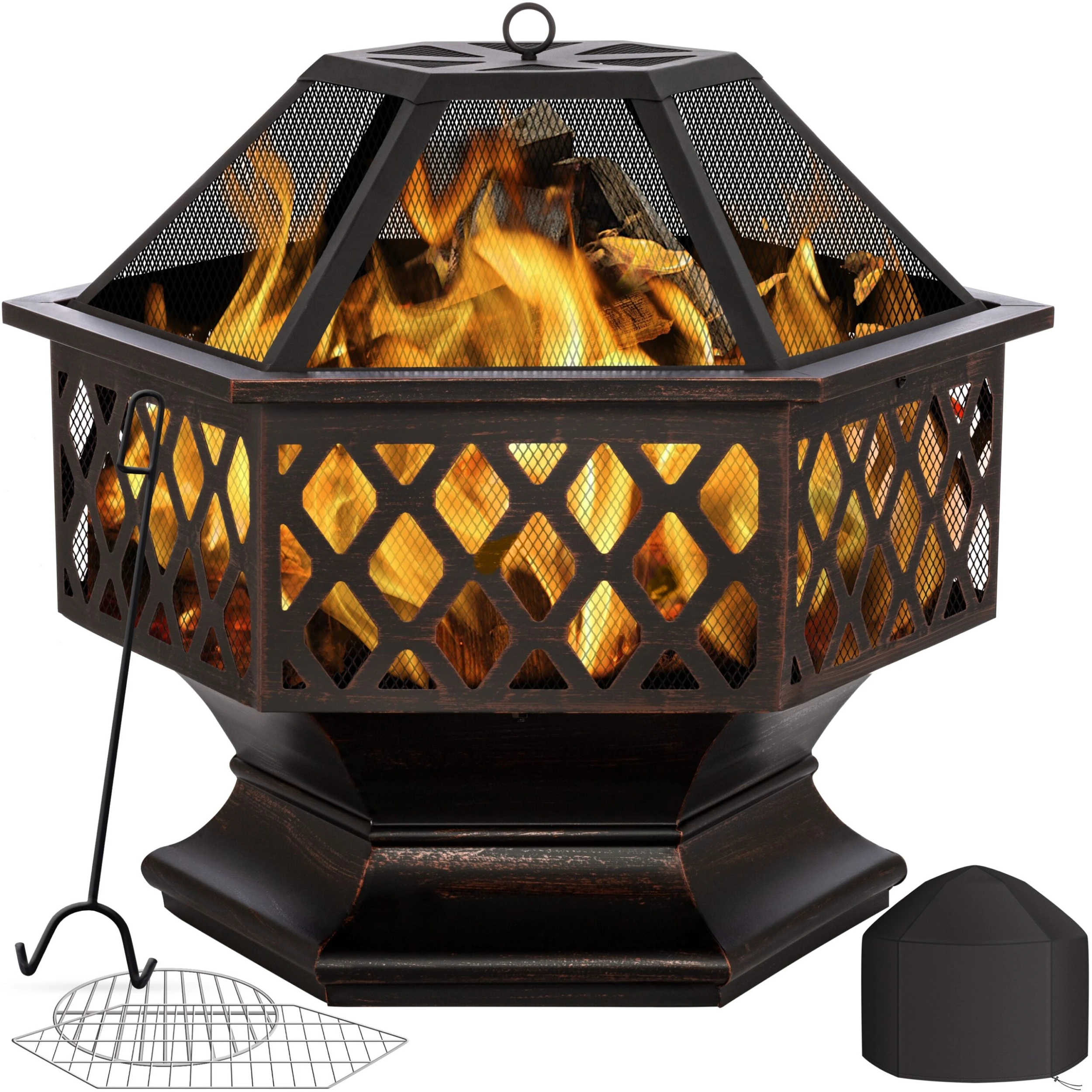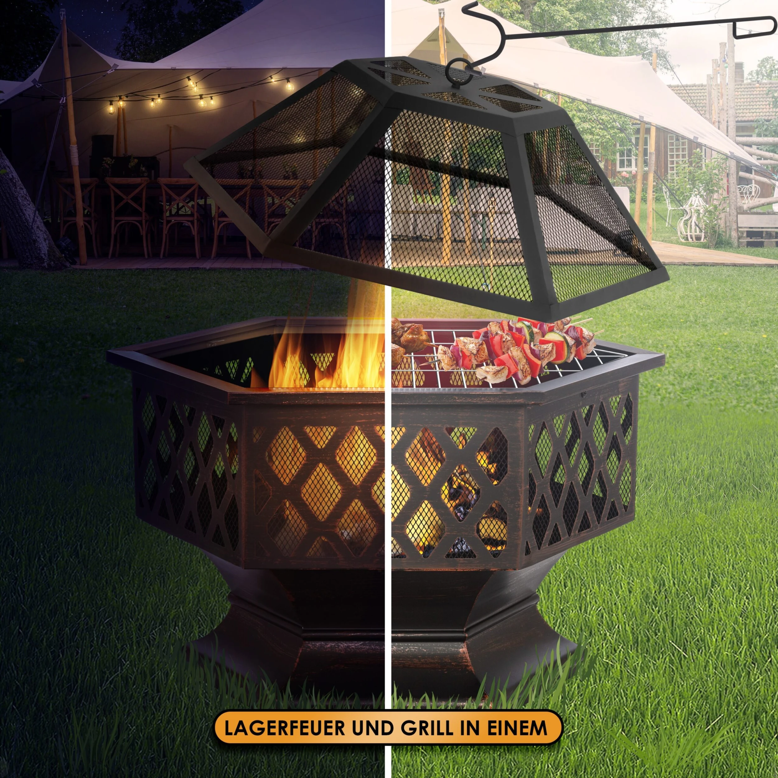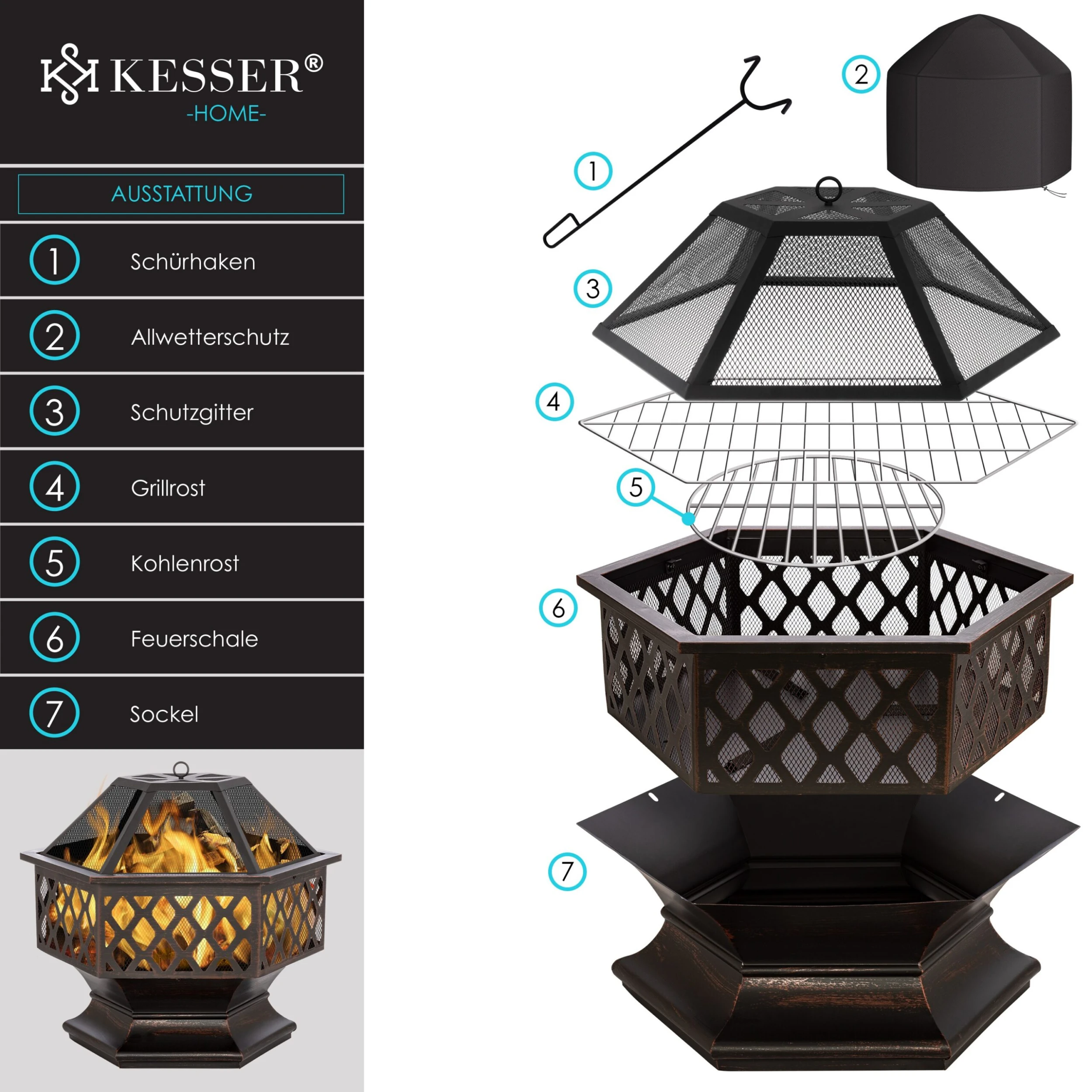 KESSER Sechskant Feuerstelle im Vintage Look und vertikaler Struktur inklusive Schürhaken, Allwetterschutzabdeckung, Schutzgitter, Grillrost, Kohlenrost und Sockel.