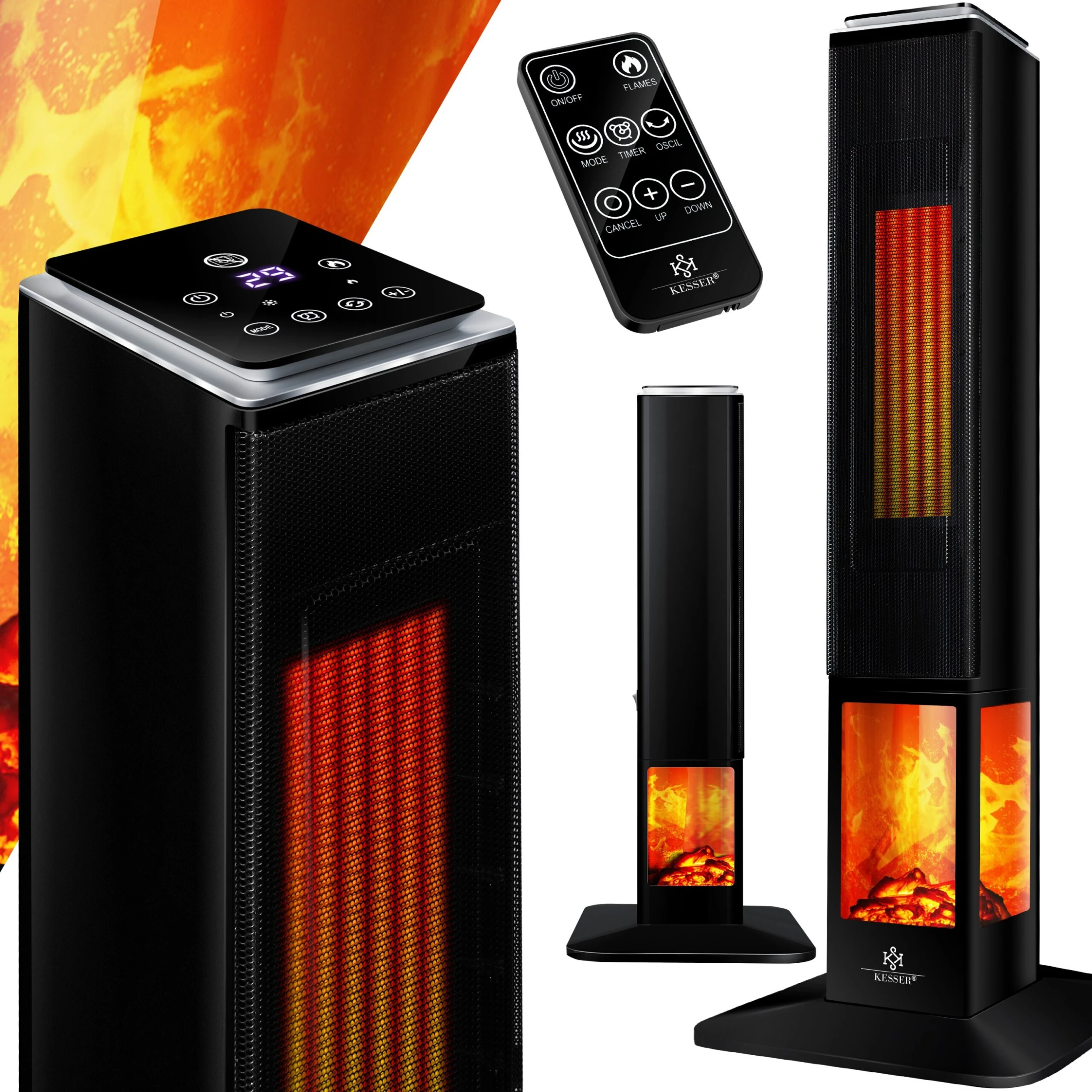 KESSER Turm-Heizstrahler per Fernbedienung steuerbar für Indoor und Outdoor mit 2 Heizstufen 1500W und 2800W,1-24h Timer, Kippschutz, PTC-Keramik-Heizelement LCD-Touch-Display und Oszillationsfunktion, gemütliches Kaminfenster