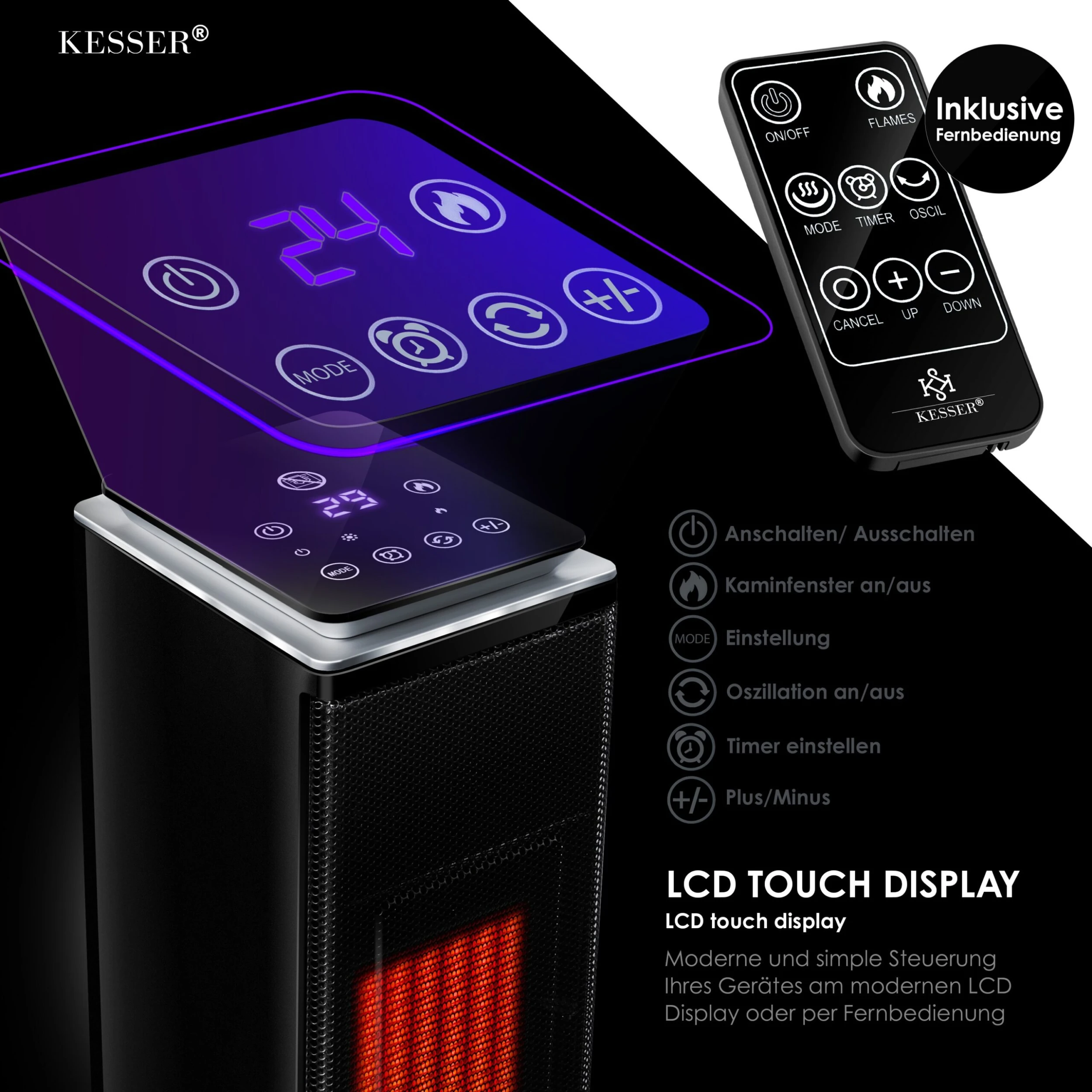Sollte die Fernbedienung nicht in greifbarer Nähe sein, können Sie den Heizturm auch direkt am Gerät selbst bedienen – Timer inklusive. Mit einer praktischen und integrierten Ablagemöglichkeit an der Rückseite wissen Sie immer wo sich Ihre Fernbedienung befindet und können diese nicht mehr verlegen. Über das LCD–Display haben Sie ebenfalls eine Vielzahl an Einstellungsmöglichkeiten. Hier können Sie das Gerät über ein Touch-Display direkt ein– und ausschalten, das Kaminfenster einstellen, Oszillation ein– und ausstellen, Timer stellen und die Stufe erhöhen oder senken.