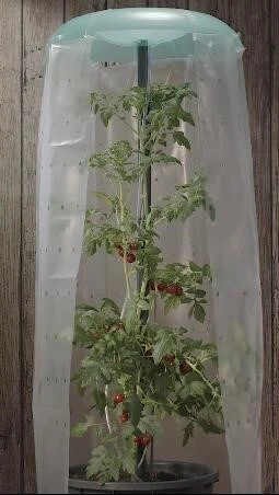 Pflanztopf Ø ca. 42 cm, H 32 cm; Tomatenhut Ø 49 x H 7 cm. Rohr Ø 2,4 x 120 cm; Folie 120 x 150 cm.