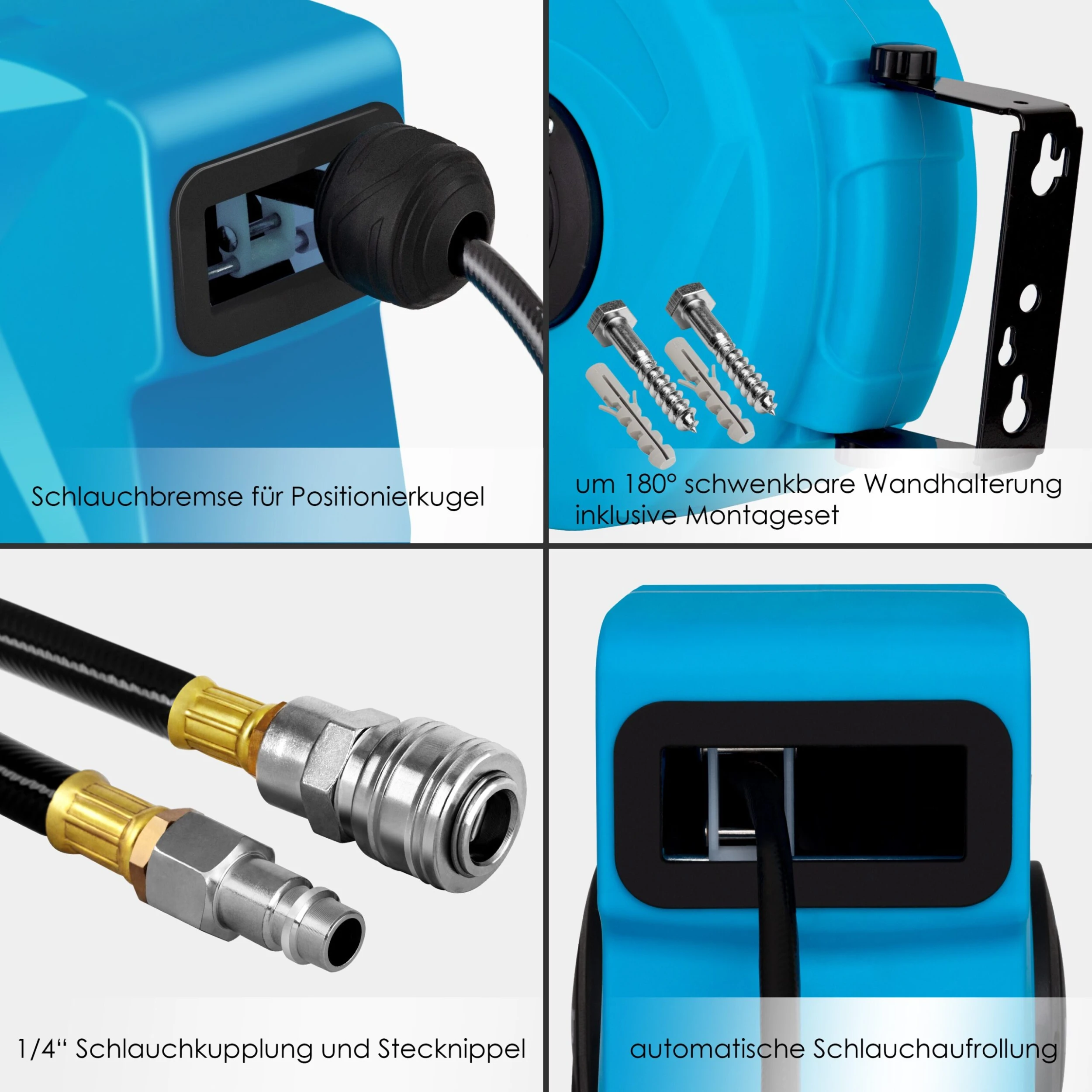 Dank der abnehmbare Wandhalterung lässt sich die Schlauchtrommel ganz einfach mit dem mitgeliefertem Montageset montieren und flexibel um 180° drehen.