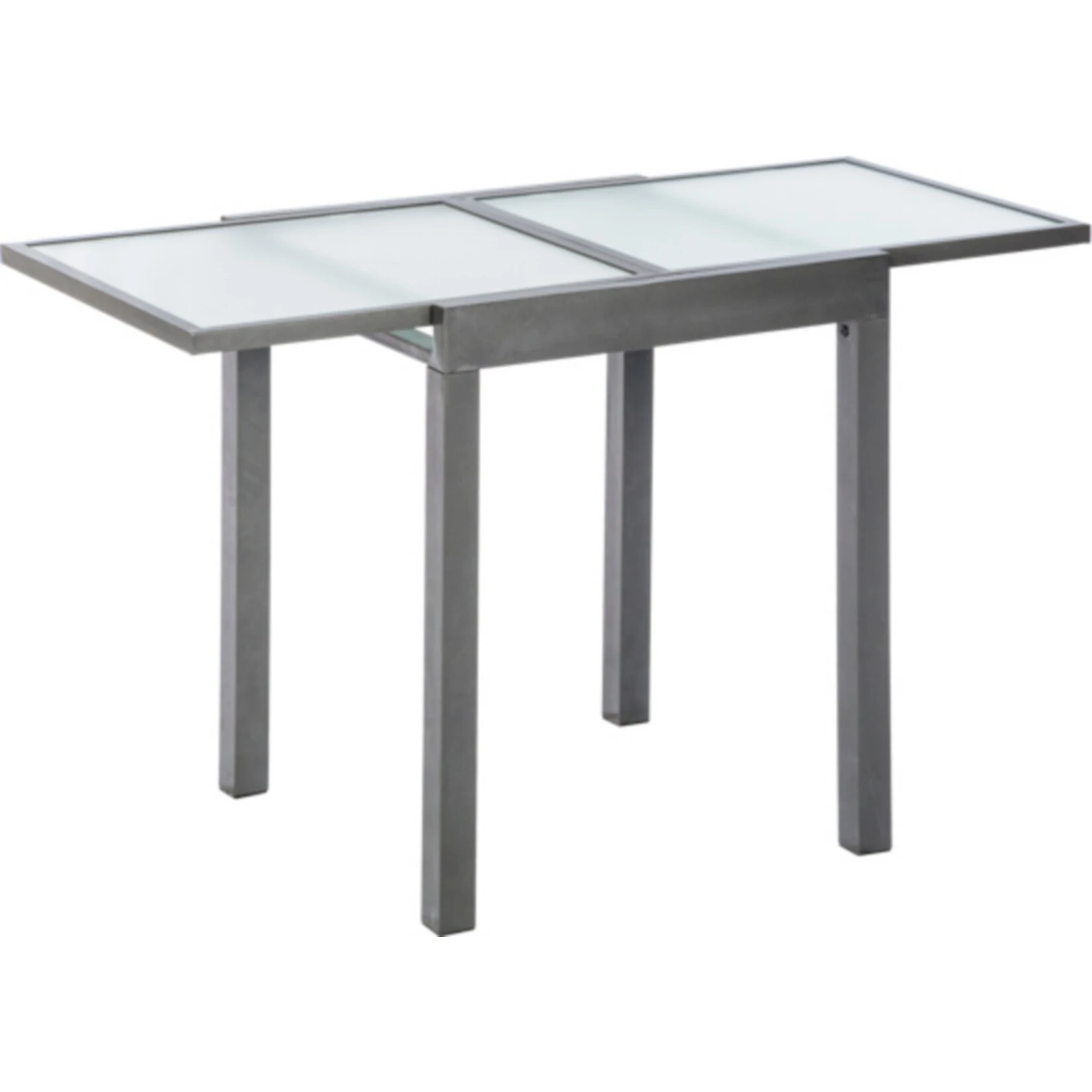 Der edle Balkonausziehtisch von Merxx mit klarer, stoßsicherer Glasplatte und silbernen Aluminiumgestell.