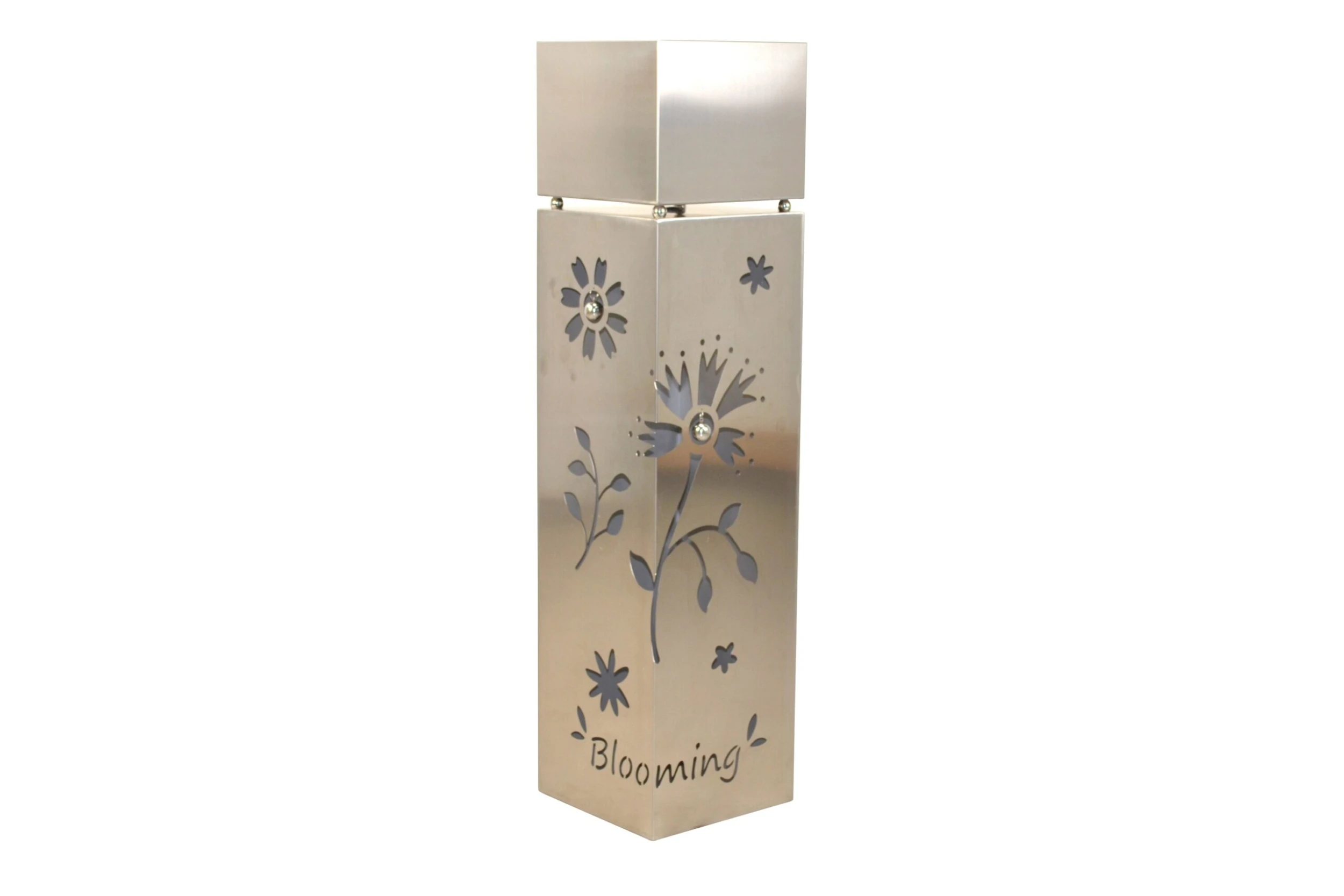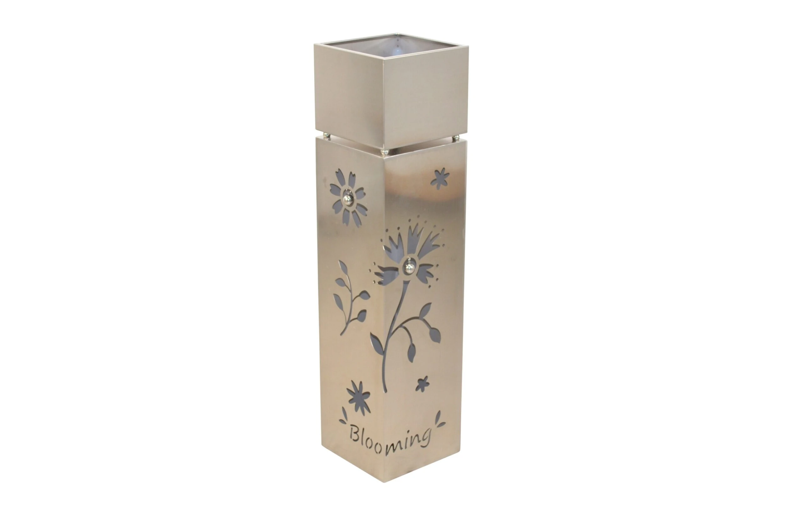 Dekorativ, praktisch und funktionell ist diese schöne Edelstahl-Pflanzensäule mit einem abnehmbaren Edelstahlpflanzenkübel. Die Oberfläche ist silberfarben, mit reichlich ausgestanzten Blumenmotiven. Gesamthöhe (mit Pflanzgefäß) ca. 102 cm, Breite 25 cm, Tiefe 25 cm. Abnehmbares Pflanzgefäß ca. 25x25x21 cm, Innenmaß ca. 22x22x20 cm. Die Pflanzschale verfügt über ein Wasserloch, damit überflüssiges Wasser abtropfen kann. Diese schöne Edelstahl-Pflanzsäule ist im Garten, im Eingangsbereich oder im Wohnbereich ein absoluter Hingucker.