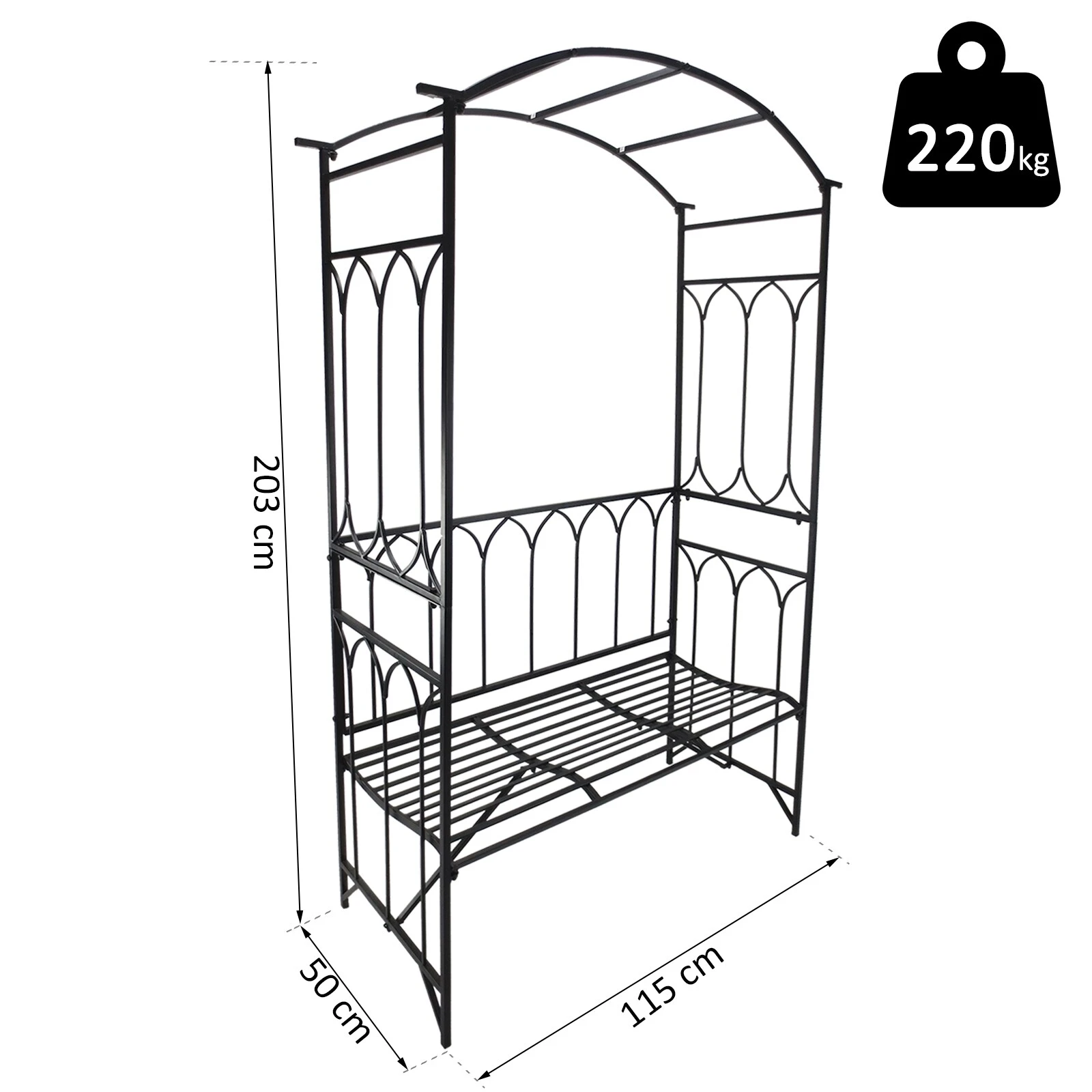 Unser Rosenbogen verleiht Ihrem Garten oder Ihrer Terrasse eine romantische Atmosphäre und ist gleichzeitig eine praktische Sitzgelegenheit. Der schwarz lackierte Metallrahmen ist nicht nur schön, sondern verleiht Ihrer Sitzbank außerdem hohe Stabilität und optimale Witterungsbeständigkeit. Das Bogendach kann als Blumengitter für Rankgewächse verwendet werden. Auf der breiten Sitzbank finden bis zu zwei Personen bequem Platz zum Entspannen. Diese Kombination aus Rosenbogen und Sitzbank wird bestimmt ein hübsches Highlight in Ihrem Außenbereich!