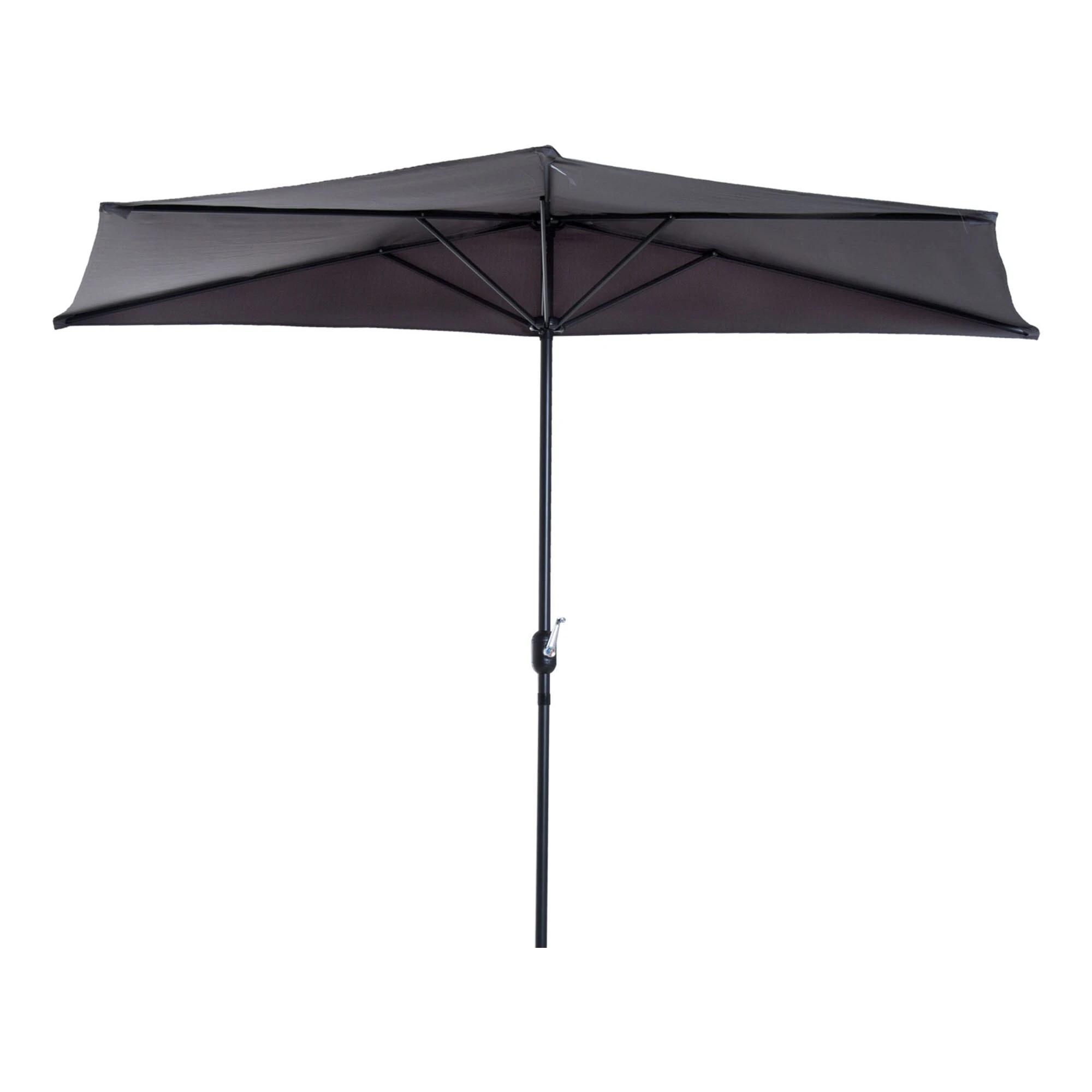 Für kleinere Terrassen und Balkons eignet sich unser graue Sonnenschirm ideal. Dank seiner halbrunden Form lässt er sich komfortabel an jede Wand stellen und nutzt den gegebenen Platz optimal aus. Der wasserabweisende Schirm ist aus 180 g/m2 starkem Polyester gefertigt und spendet Ihnen angenehmen Schatten. Schirmstange und Verstrebungen sind aus pulverbeschichtetem Aluminium gefertigt und verleihen Ihrem Schirm Standfestigkeit. Das wertige Material überzeugt durch sein geringes Gewicht bei hoher Belastbarkeit. Durch die integrierte Handkurbel haben Sie Ihren Schirm in Windeseile aufgestellt. Kompakt, durchdacht und simpel. Das ist unser Kurbelschirm.