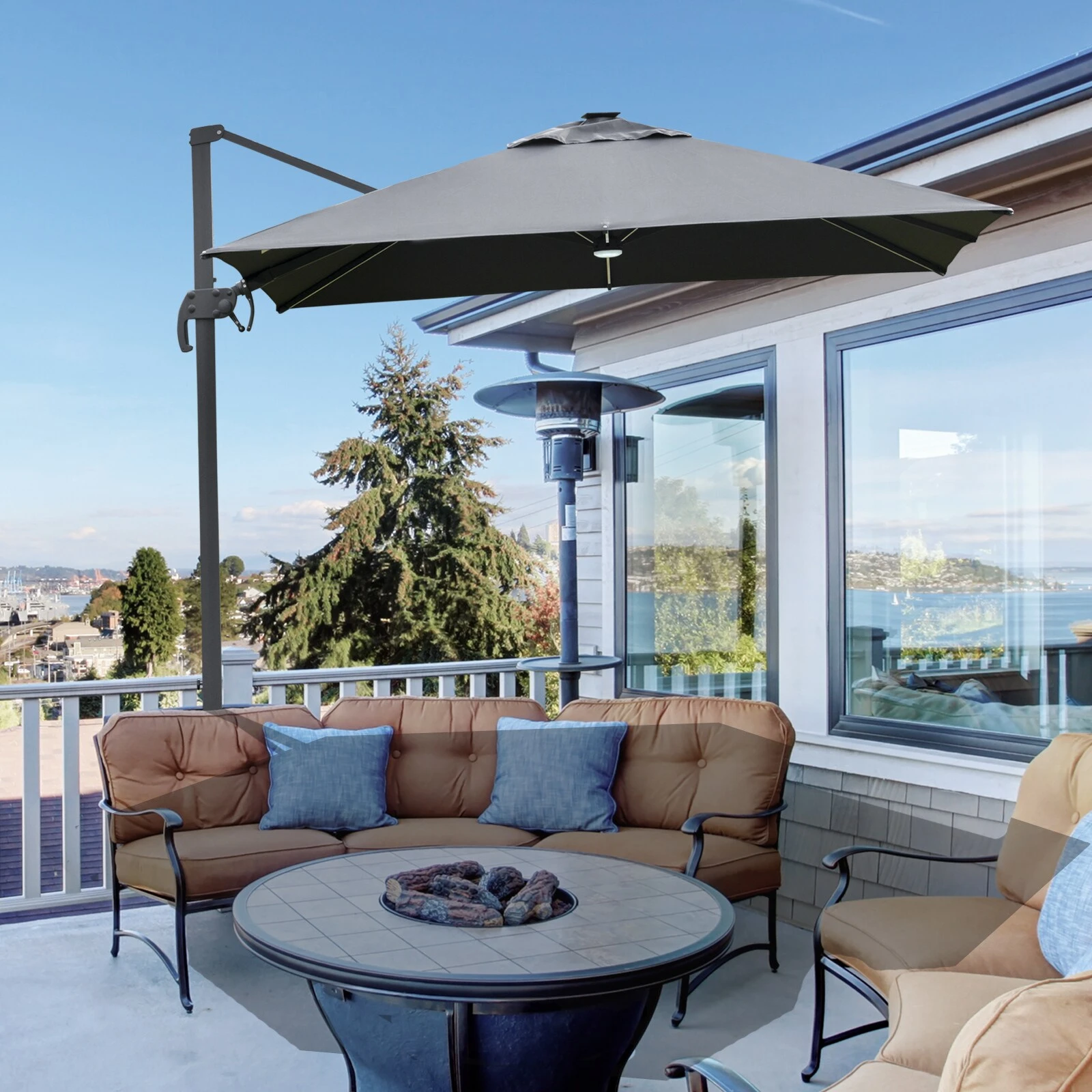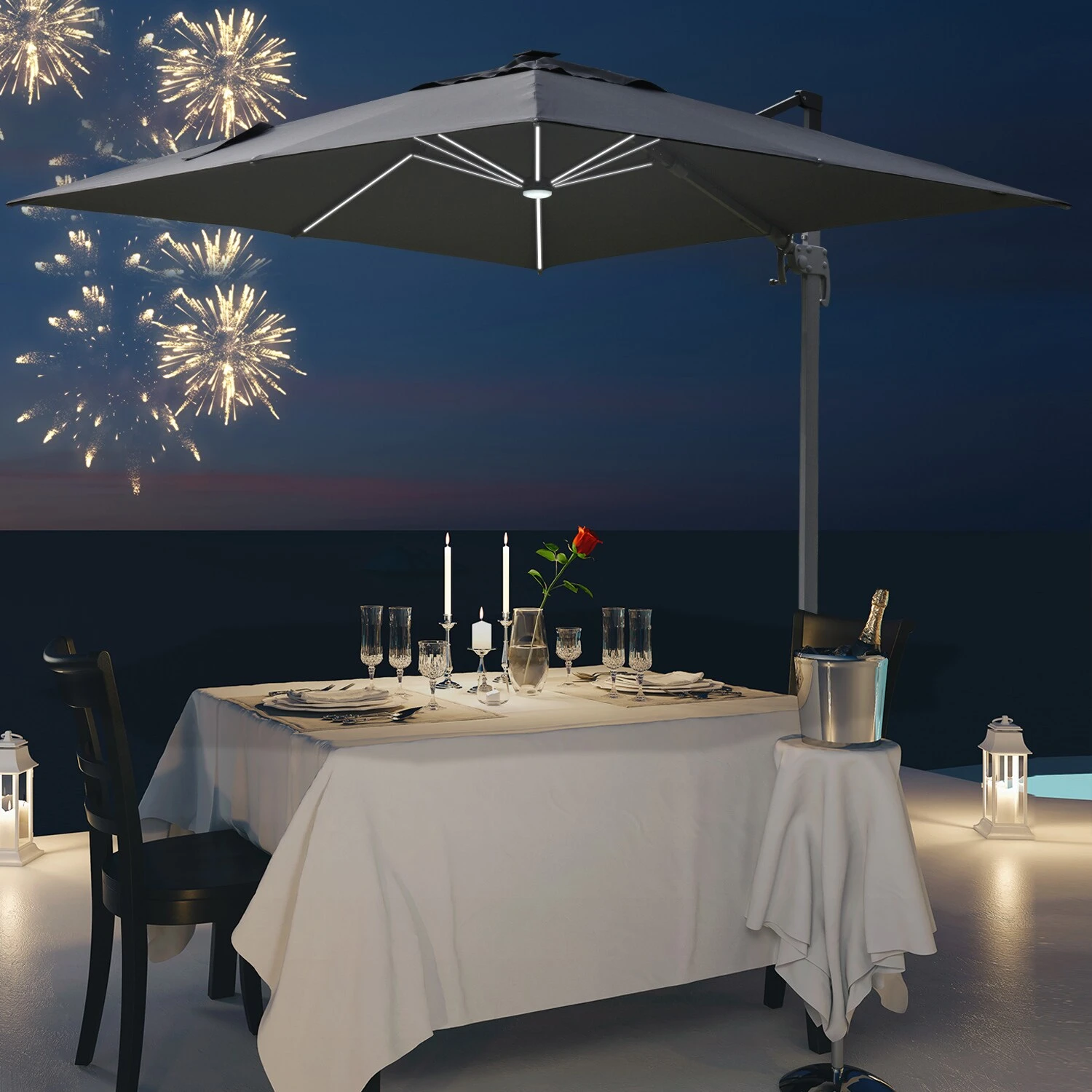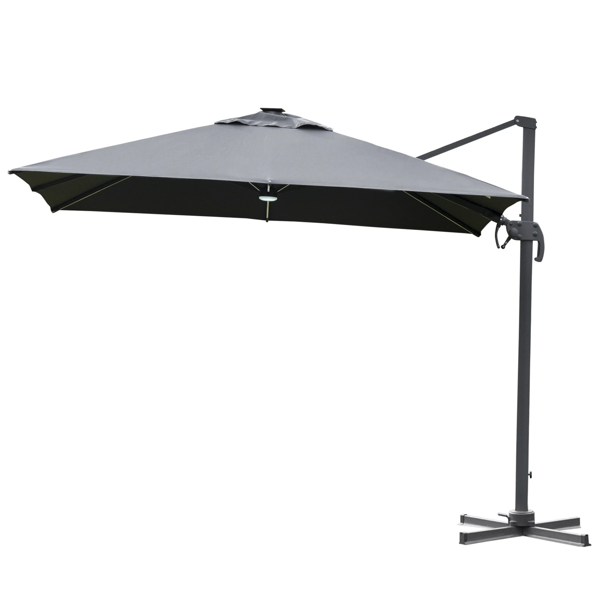Unser großer Cantilever-Sonnenschirm bietet Ihnen den besten Schatten für sonnige Tage. Das Schirmdach aus Polyester bietet Schutz vor direkter Sonneneinstrahlung und Hitze. Mit einem Kurbelmechanismus für müheloses Öffnen und Schließen kann das Schirmdach um volle 360 Grad gedreht werden, damit Sie den ganzen Tag lang geschützt sind. Angetrieben durch ein Solarpanel, können die LED-Leuchten an den Rippen Ihnen mehr Licht in der Nacht bieten.