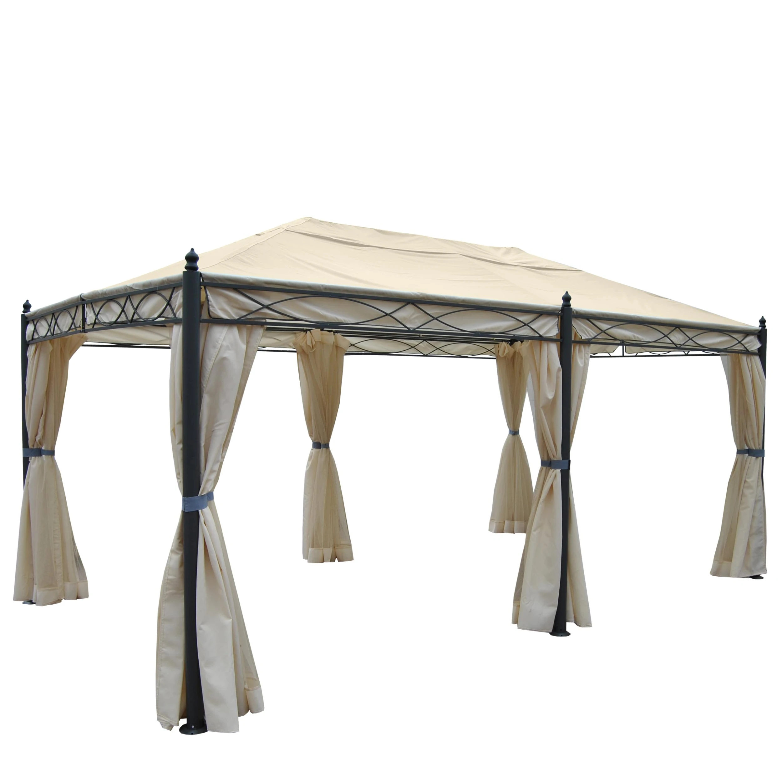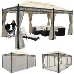 Bedenken Sie bitte, dass das mitgelieferte Dach bis zu einem gewissen Grad regenbeständig ist und sich dadurch Wasser dort ansammeln kann. Dies kann bei großer Wassermenge zu Beschädigungen führen. Sofern Sie auf die Regenbeständigkeit verzichten möchten, können Sie mittels einer Lochzange (nicht mitgeliefert) und Ösen einen Ablauf schaffen. Grundsätzlich empfehlen wir, das Dach vor größeren Regenschauern abzubauen. Ebenso müssen wir darauf hinweisen, dass bei Schnee der Bezug demontiert werden muss, da die Dachstreben für diese Last nicht ausgelegt sind. Die Pergola wird mit Schrauben montiert. Diese sind aus Stahl und können – da es sich um Schrauben handelt – nicht pulverbeschichtet werden. Daher werden diese unter normaler Witterung mit der Zeit rosten. Dieser Rost wird jedoch meist erst bei der Demontage des Daches sichtbar. Sofern das stört kann der Rost mit handelsüblichen Rostentferner von Ihnen leicht entfernt werden.