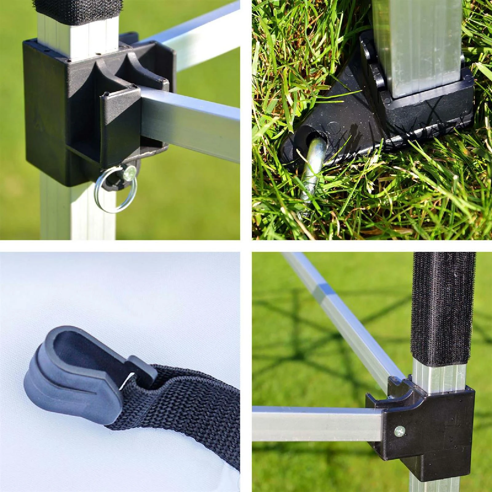 Seitenwände werden an den Standbeinen mit Klettbändern (je 5 pro Seite) und am Dachgestell mit Kunststoff-Haken (4 Stk) sicher befestigt
