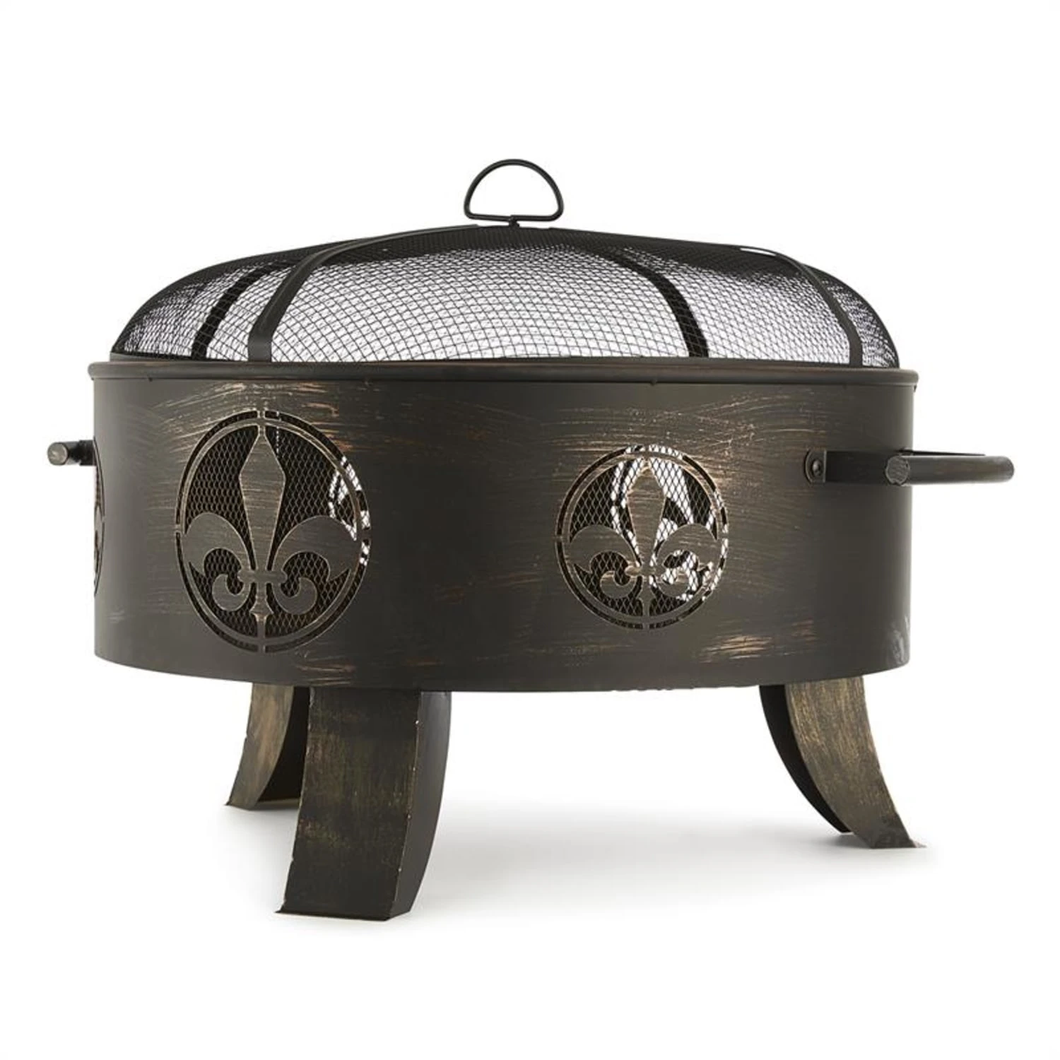 Große Feuerschale aus Stahl im Vintage-Look mit Fleur-de-Lis-Muster, 60 cm Durchmesser und drei stabilen Standfüßen.
