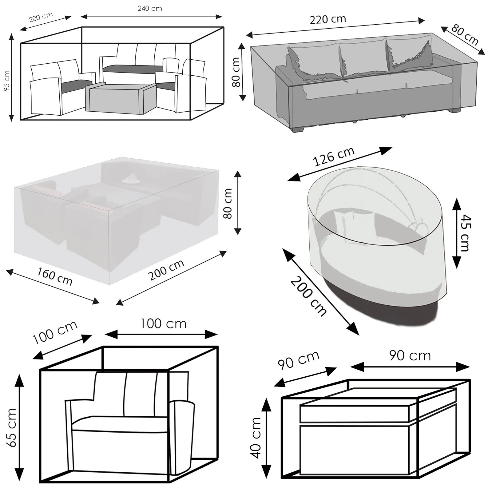 Für Garten-Lounge-Set 2: 240 x 200 x 95 cm - Für Lounge-Tische: 90 x 90 x 40 cm